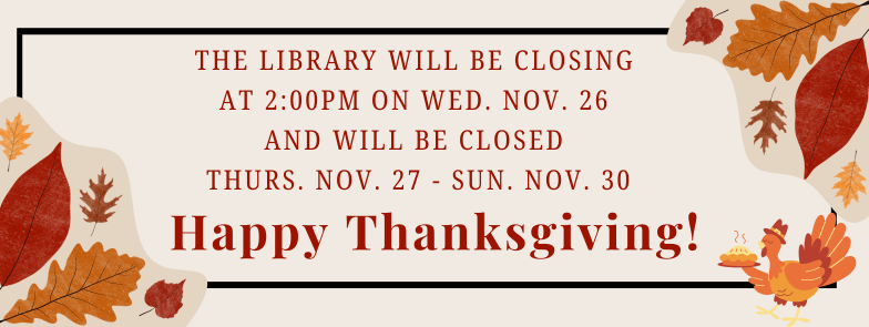 The library will close at 2:00 pm on Wednesday, November 26 and will be closed through Sunday, November 30.